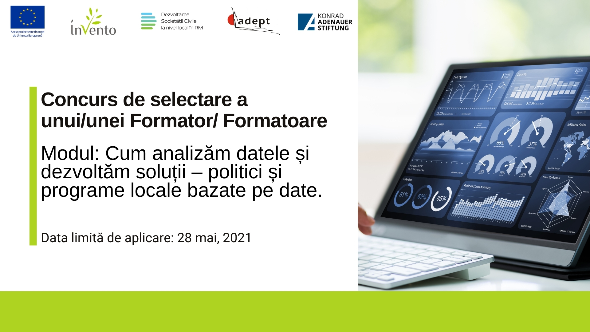 În acest sens, în vederea realizării obiectivelor de proiect și pentru a asigura vizibilitatea și realiza planul de comunicare, INVENTO este în căutarea unui formator/ unei formatoare în format e-learning pentru modulul „Cum analizăm datele și dezvoltăm soluții – politici și programe locale bazate pe date”.