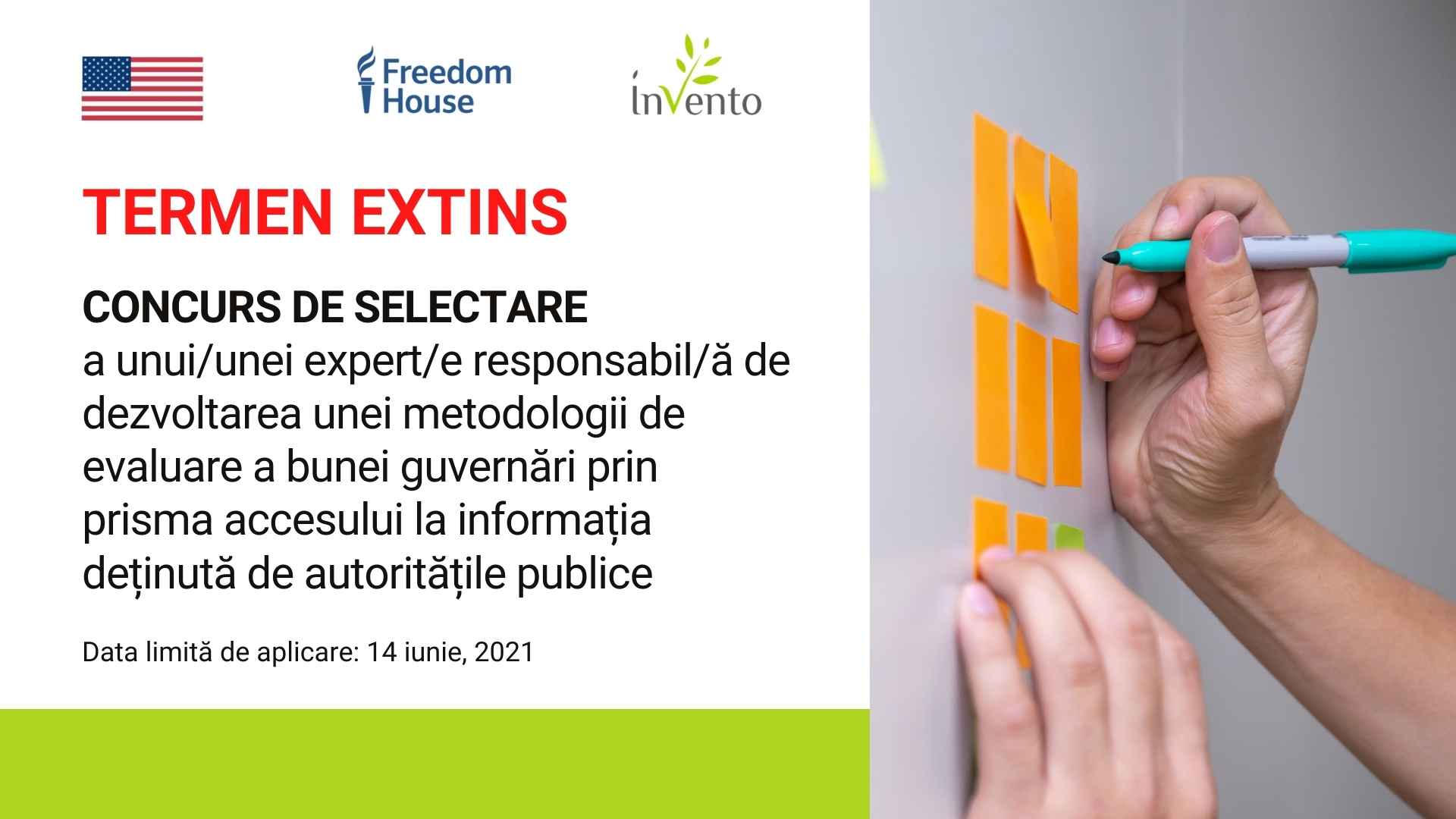 În vederea atingerii scopului de proiect, INVENTO anunță concurs de selectare a unui expert responsabil de dezvoltarea unei metodologii de evaluare a bunei guvernări prin prisma accesului la informația deținută de autoritățile publice.